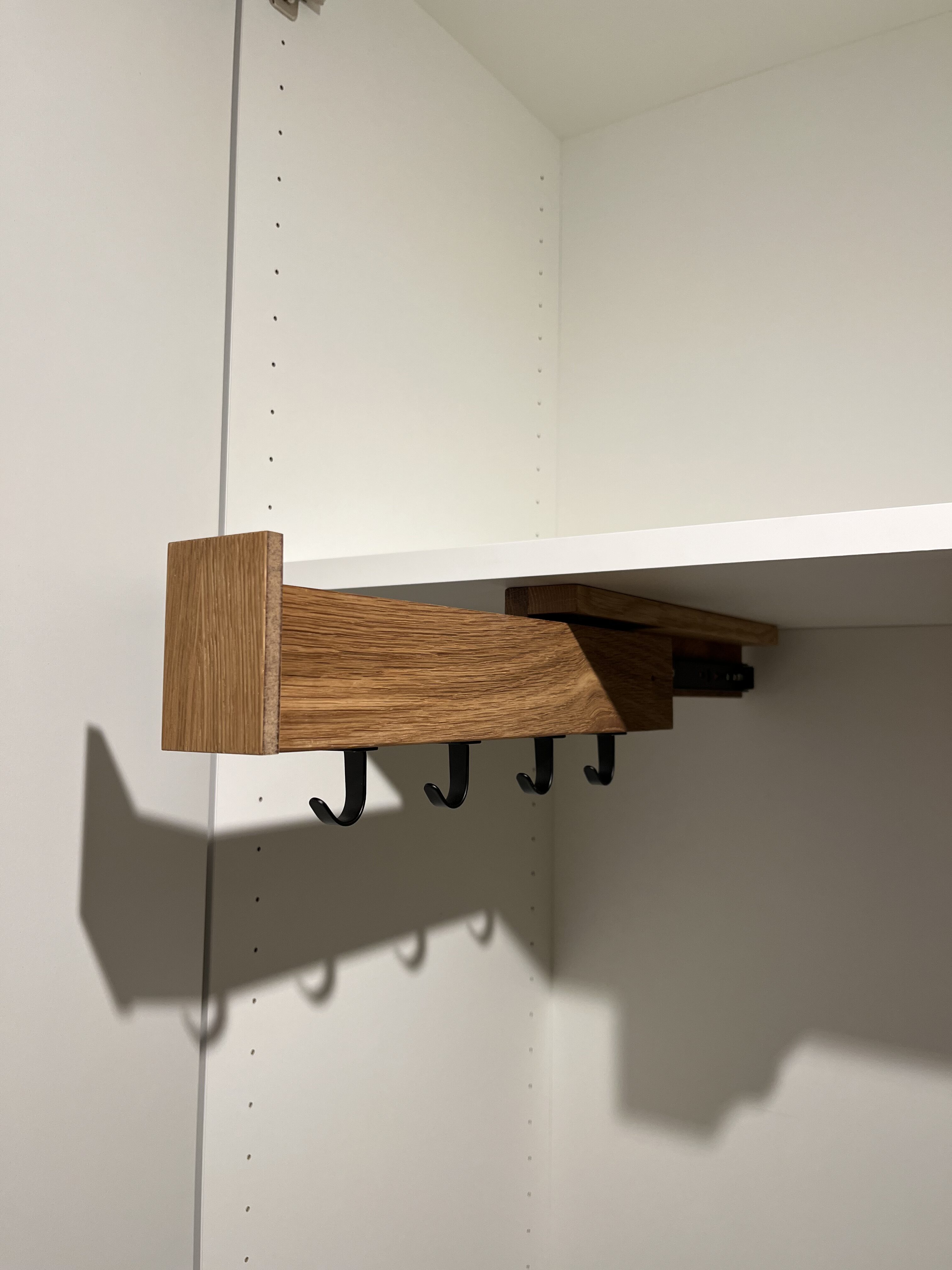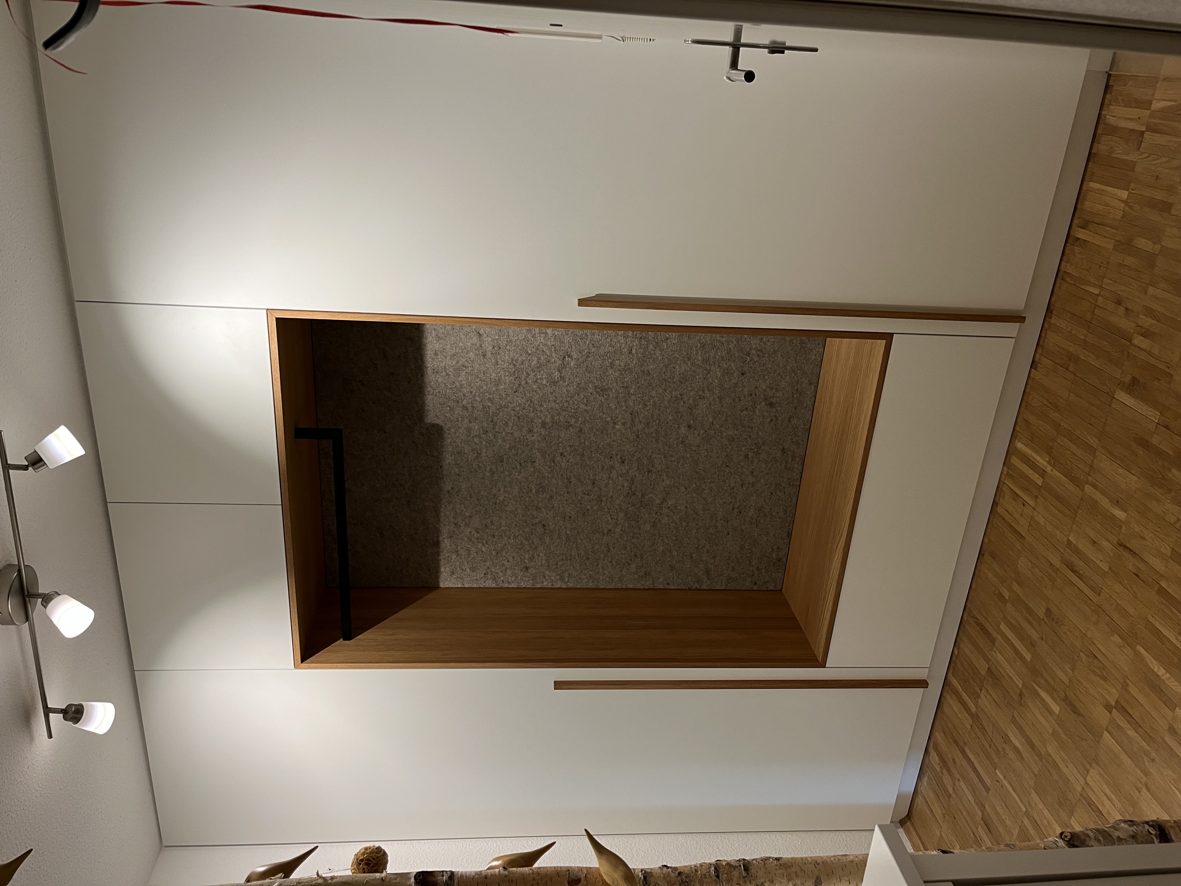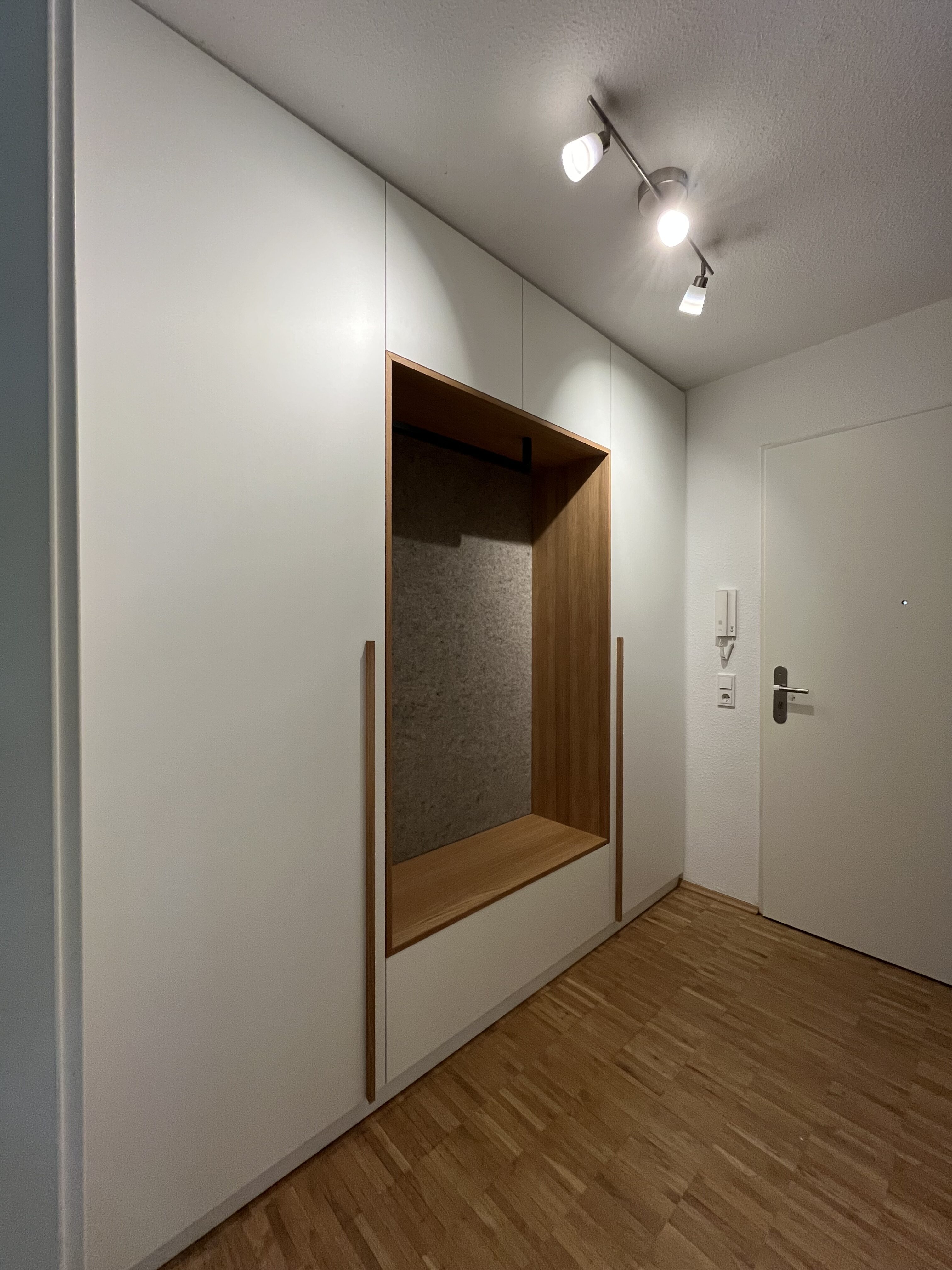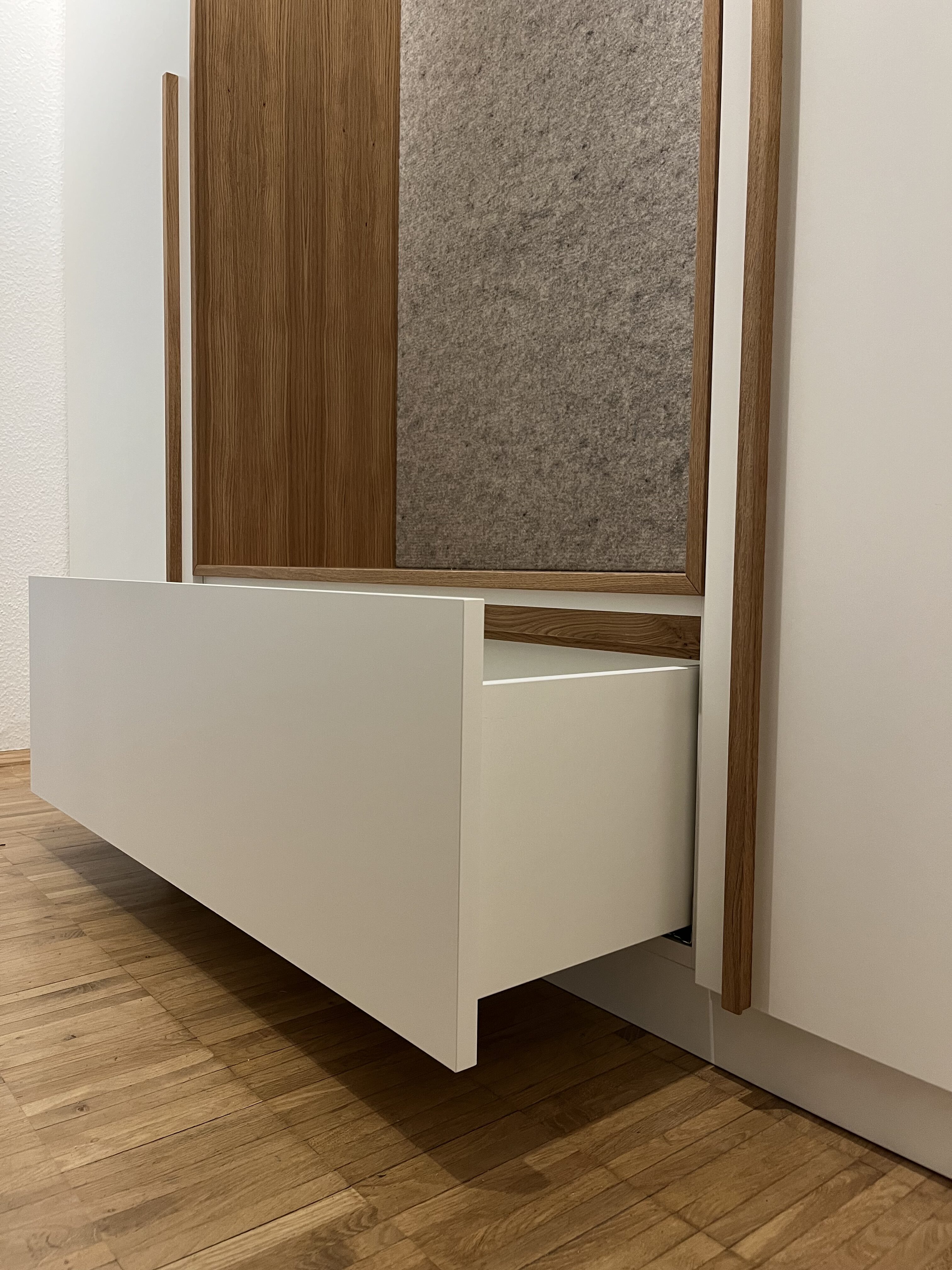 Fronten in Dekor weiß mit Griffleisten in Eiche MassivholzOffenes Fach in Eiche furniert, geöltSitzbankrückwand in Filz