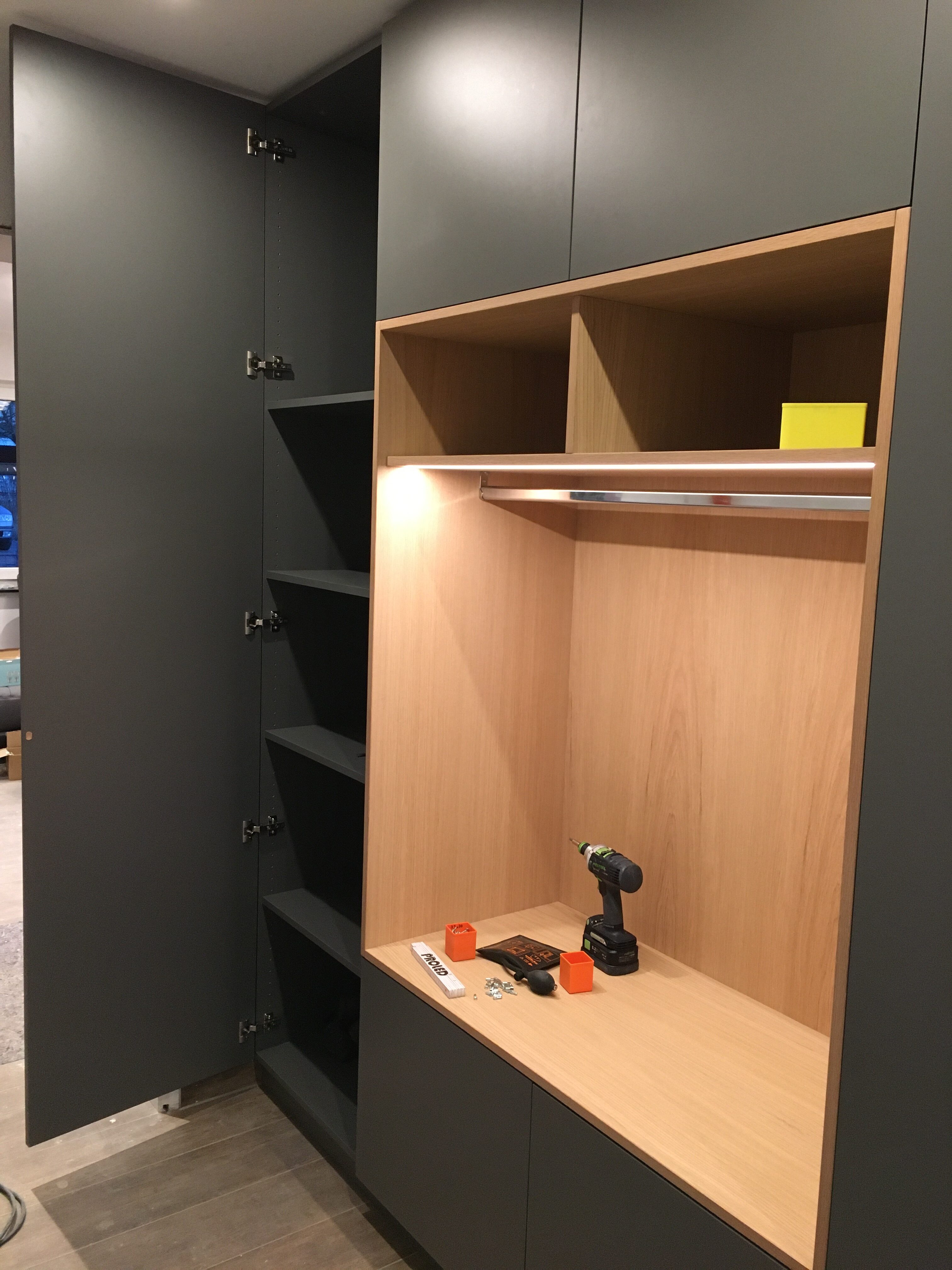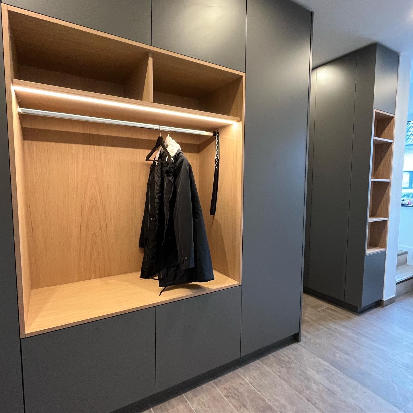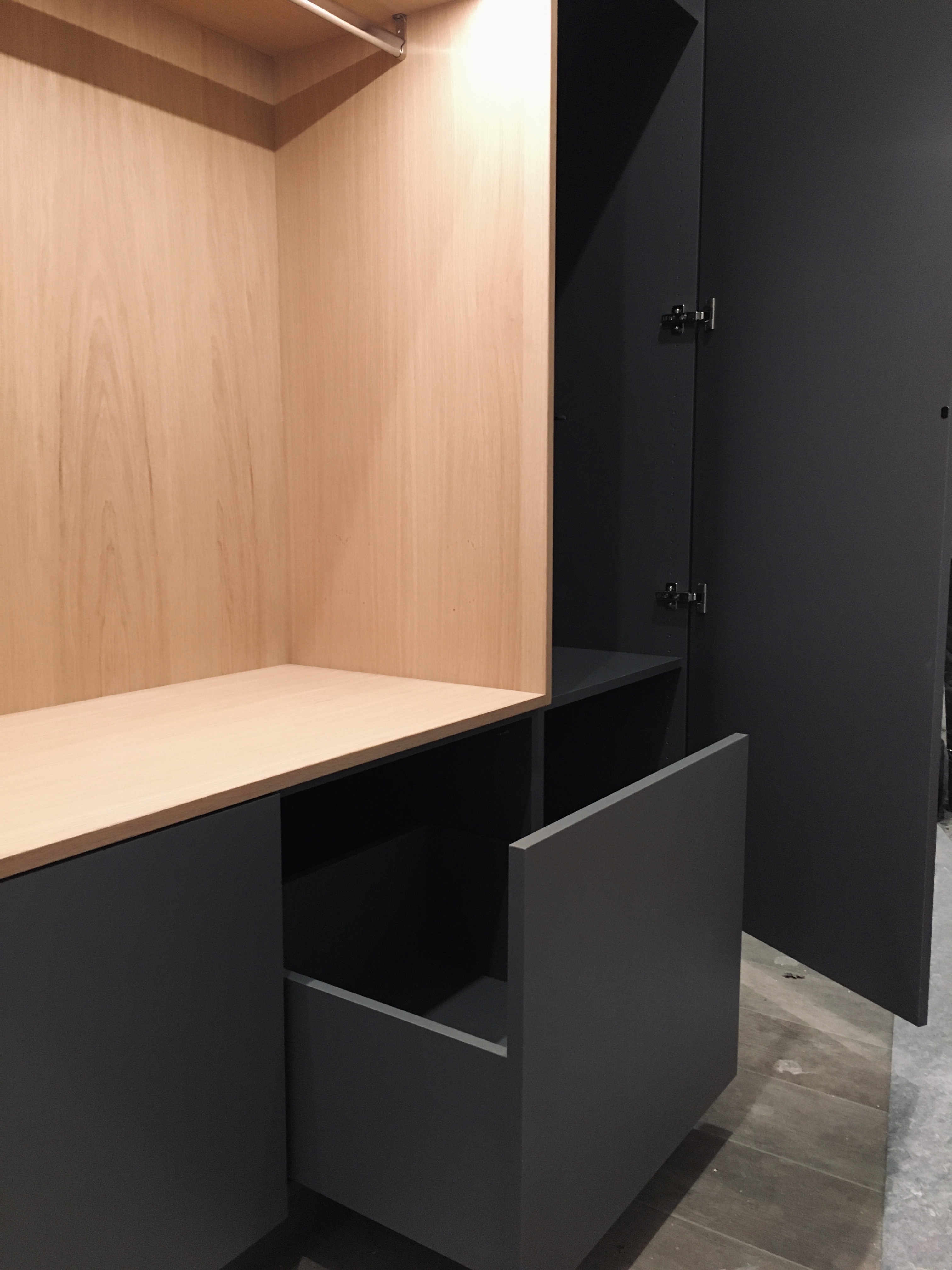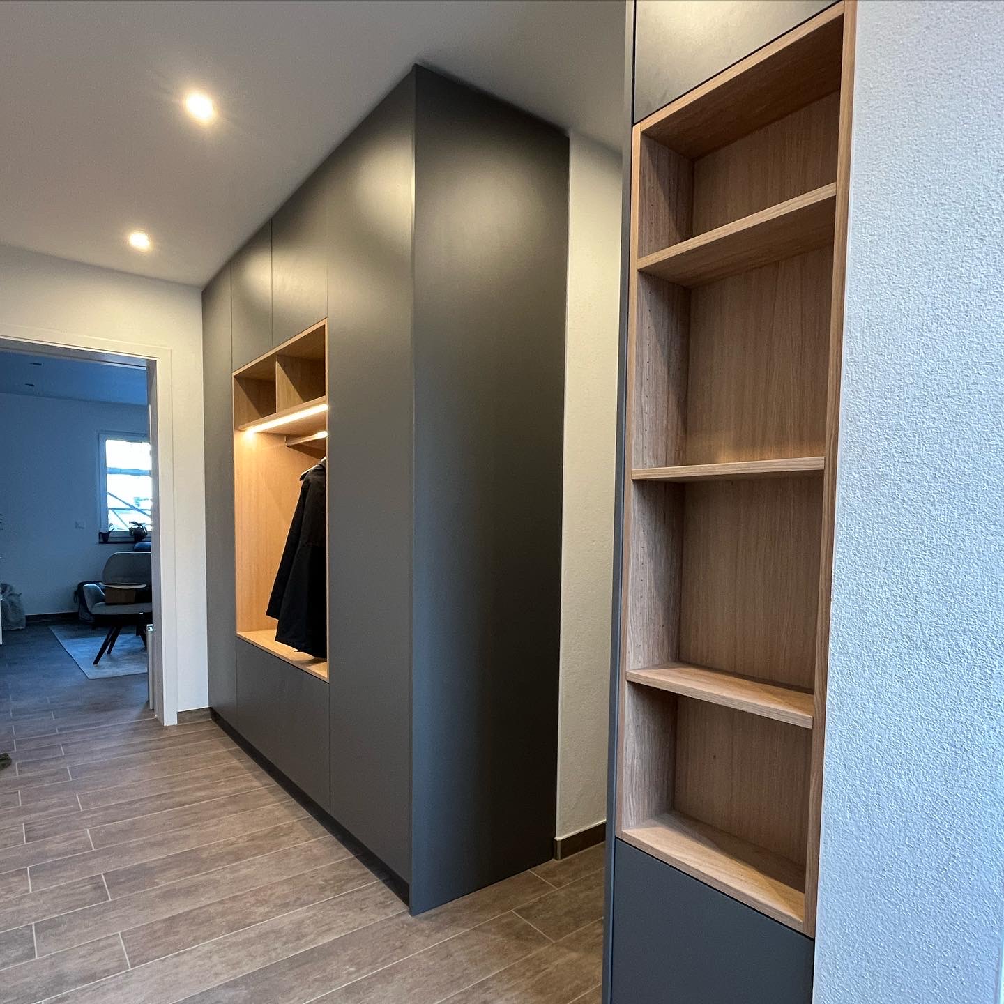 Garderobenschränke in dunkelgrau Dekoroberfläche und Eiche furniert geölt