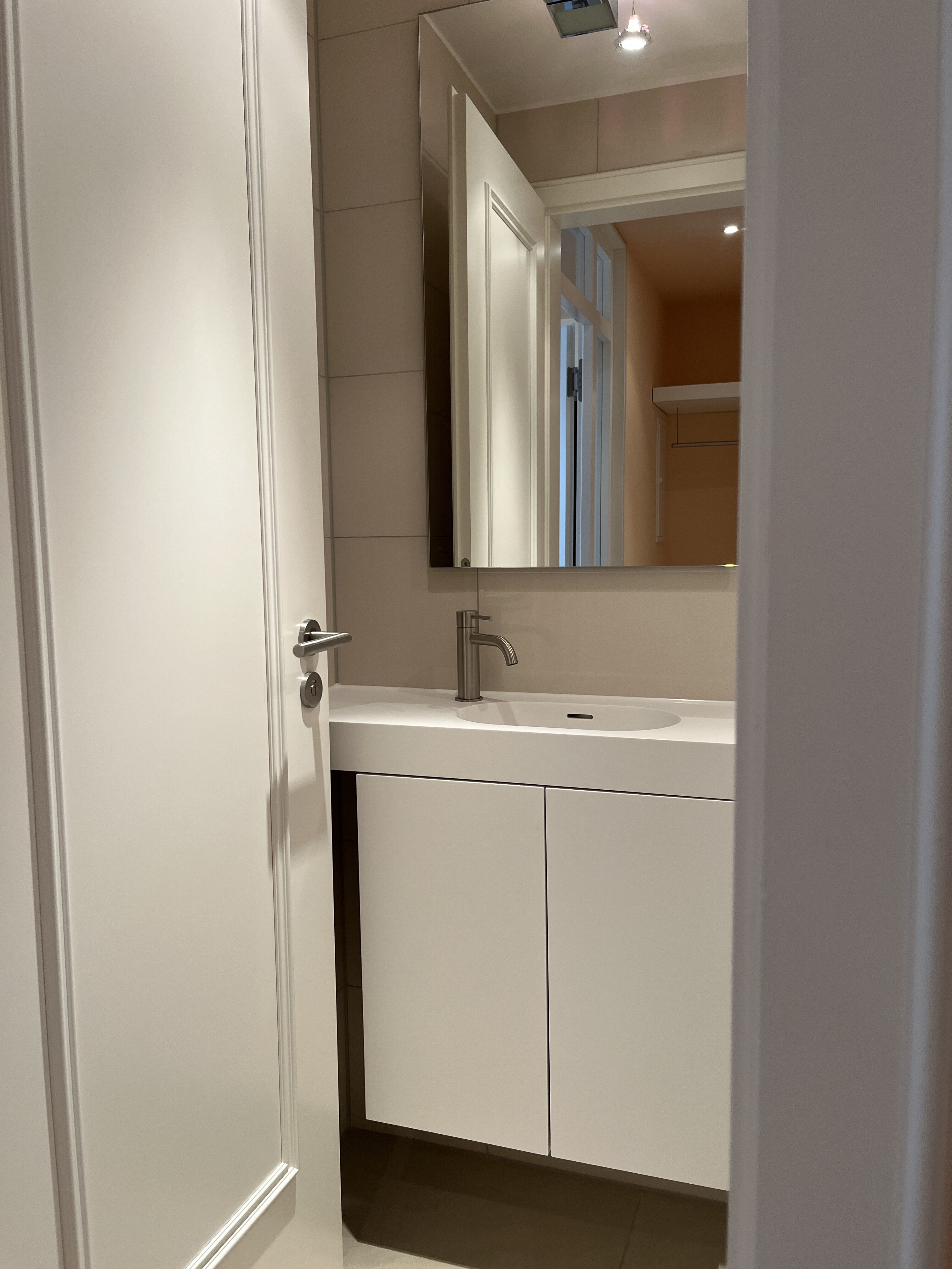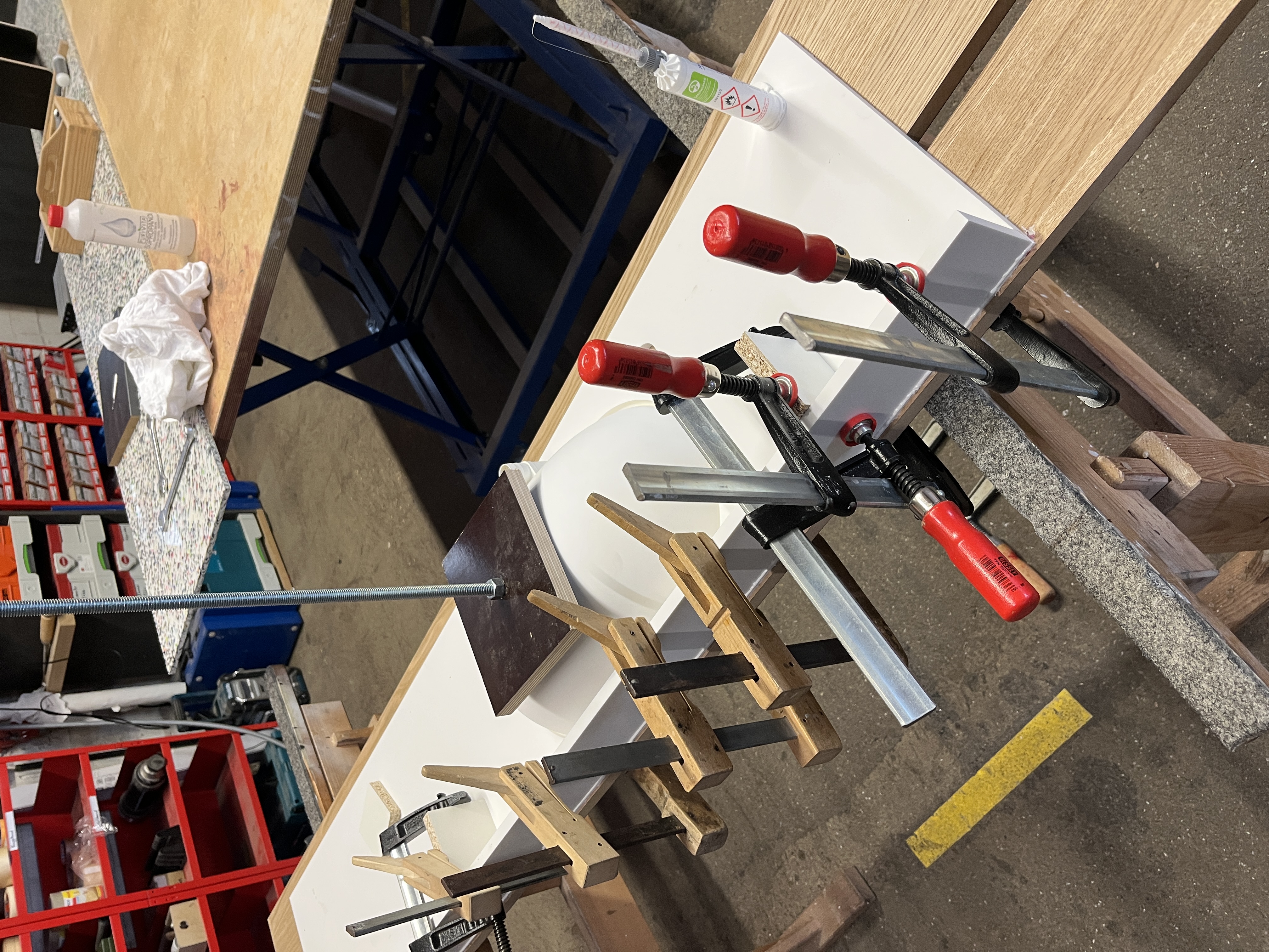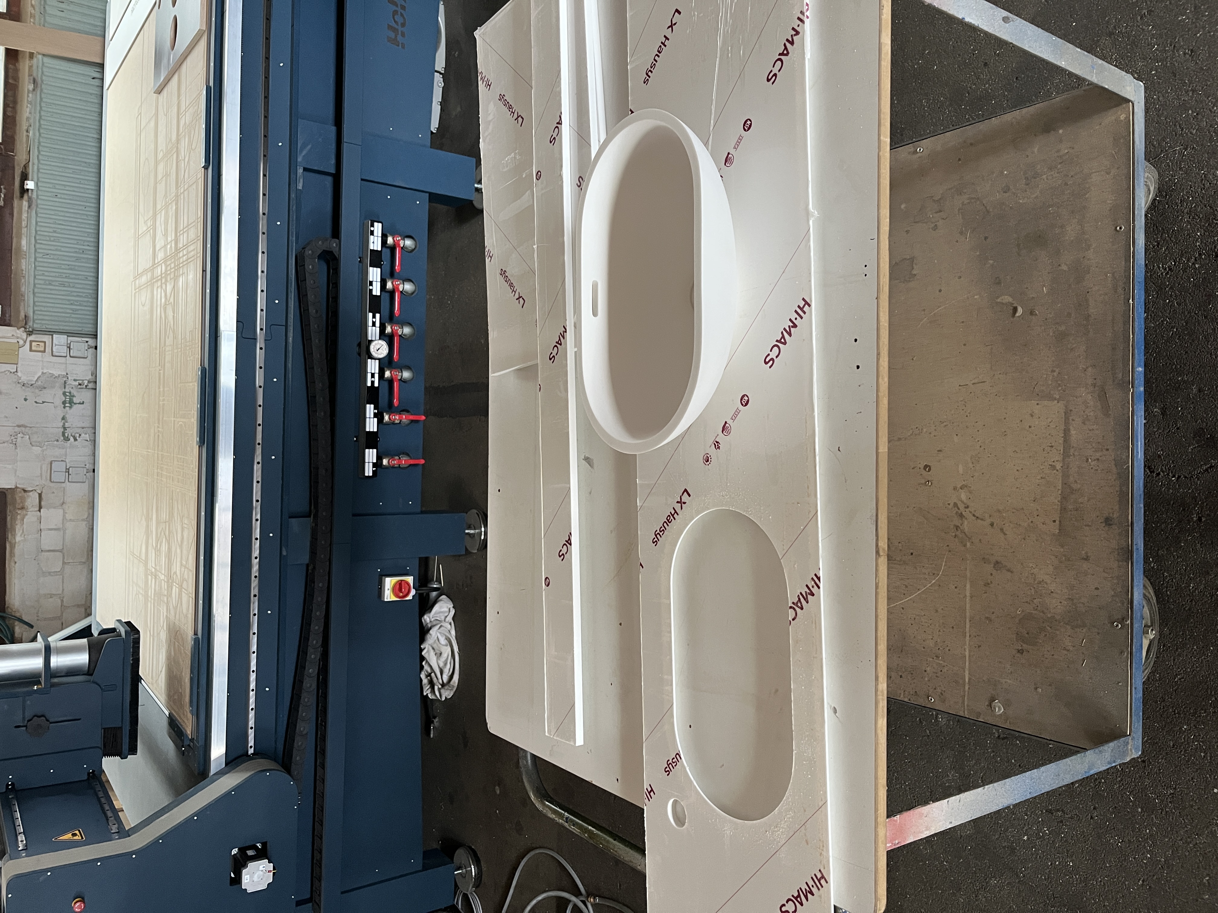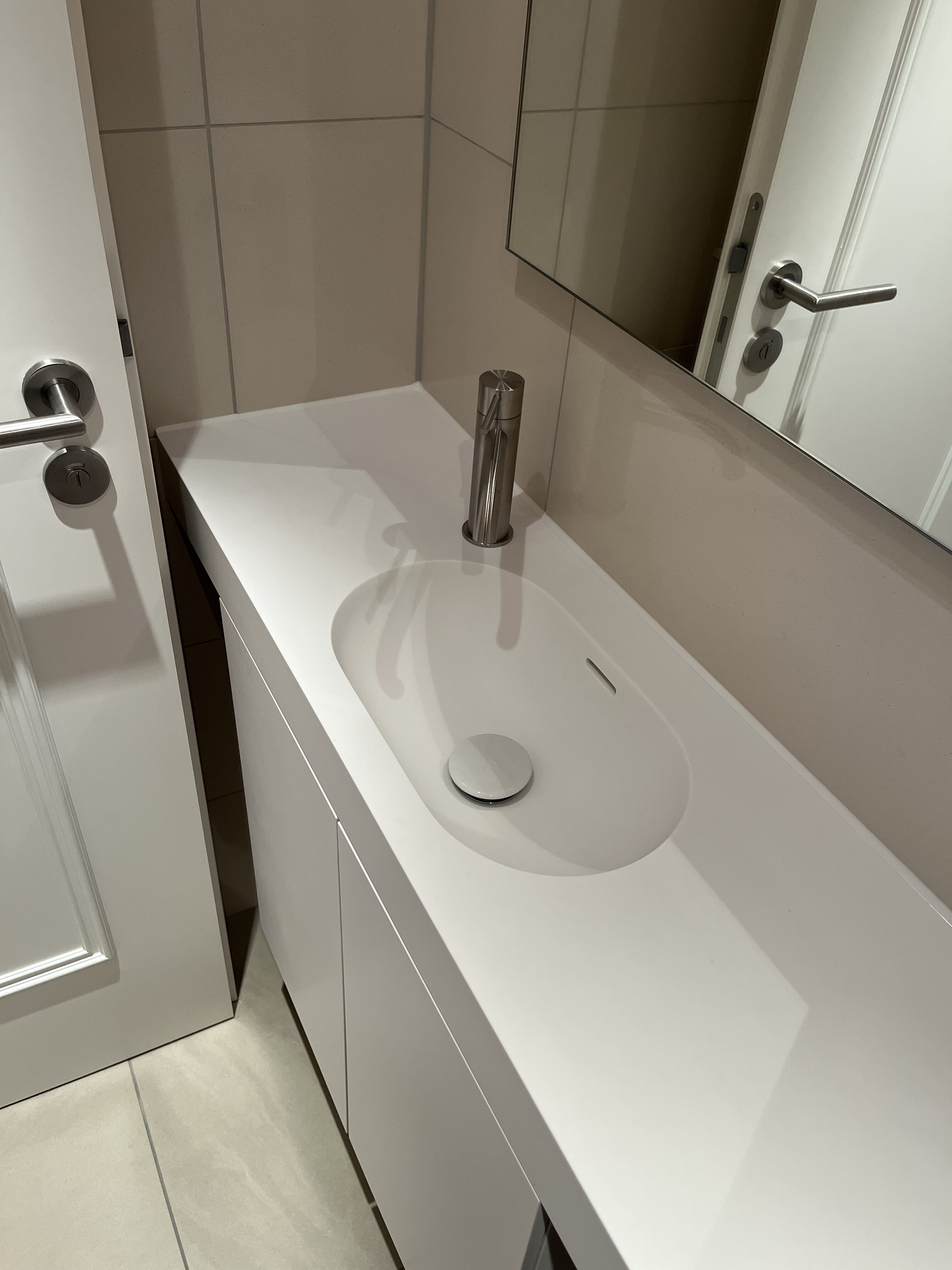 Waschtisch komplett in Mineralwerkstoff weißDeckplatte mit Abkantung und Unterbauspülbecken ebenfalls in Mineralwerkstoff